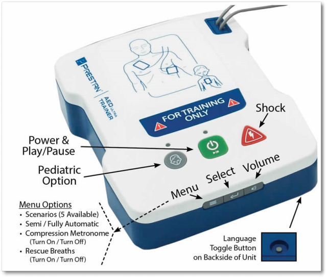Instructors can customize their training classes with options to turn on or off the compression metronome and/or the “give breaths” voice prompt.